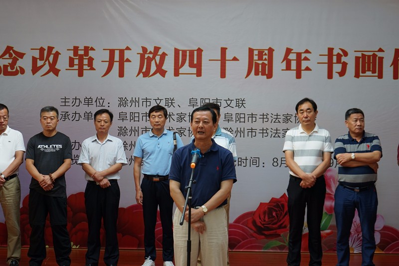 周全教在致辞中指出,滁州阜阳,历来交往甚密,文脉相通,情远谊长。阜阳,黄淮明珠,人文鼎盛,是管仲故里,嵇康桑梓;滁州江淮翡翠,山明水秀,东晋肇始,北宋发端。一代文宗欧阳修在两地都留下了浓墨重彩的传世之作,千古佳话。此次书画联展是一次两市展示技艺、品墨结谊的盛典与雅集,汇集了两地老中青书画家的精品力作,为弘扬传统文化精粹、丰富群众文化需求,以及推动滁阜文化交流与发展起到积极的促进作用。希望书画家们借助展览契机,取长补短、借鉴创新,创造出更多讴歌时代、反映生活,兼具徽风皖韵的艺术精品,为繁荣两市文艺事业增光添彩!