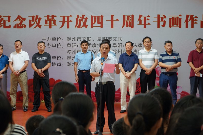琅琊山上层林染,清流河畔金谷香。8月29日,“滁州·阜阳庆祝改革开放40周年书画作品联展”在滁州美术馆拉开帷幕。滁州市政协第五届主席何希勇宣布开幕,滁州市委宣传部常务副部长、市文联党组书记、主席周全教致辞,阜阳市文联党组书记、主席李平,滁州市文联党组成员、副主席贾鸿彬等领导以及社会各界的广大书画爱好者出席了开幕仪式。