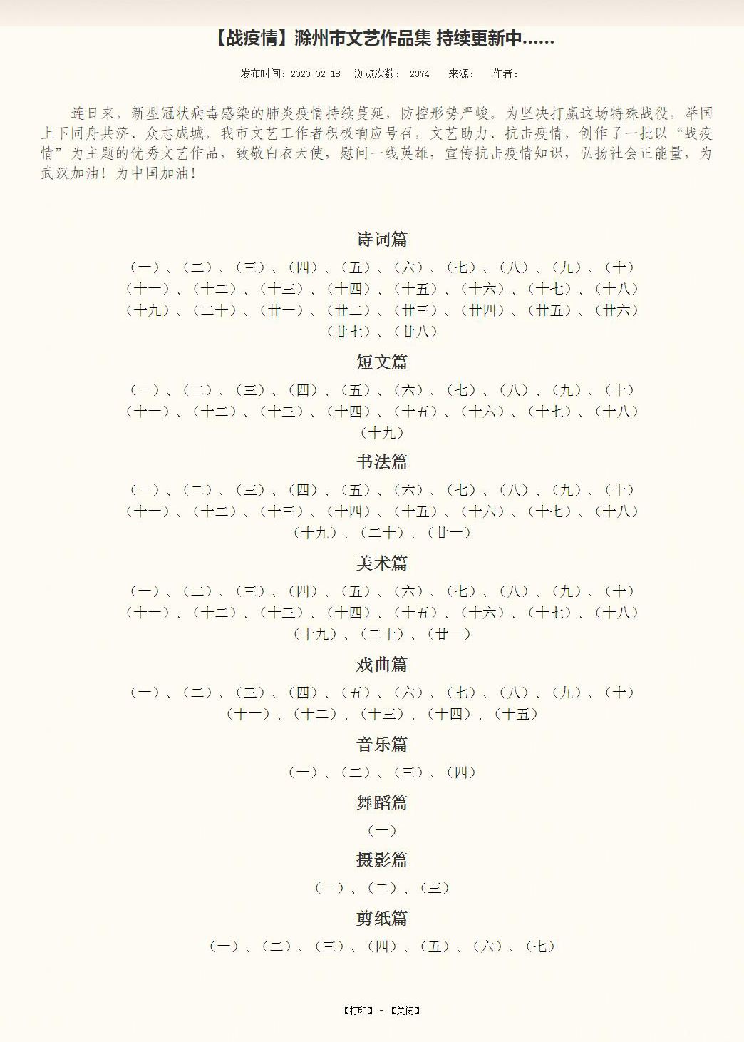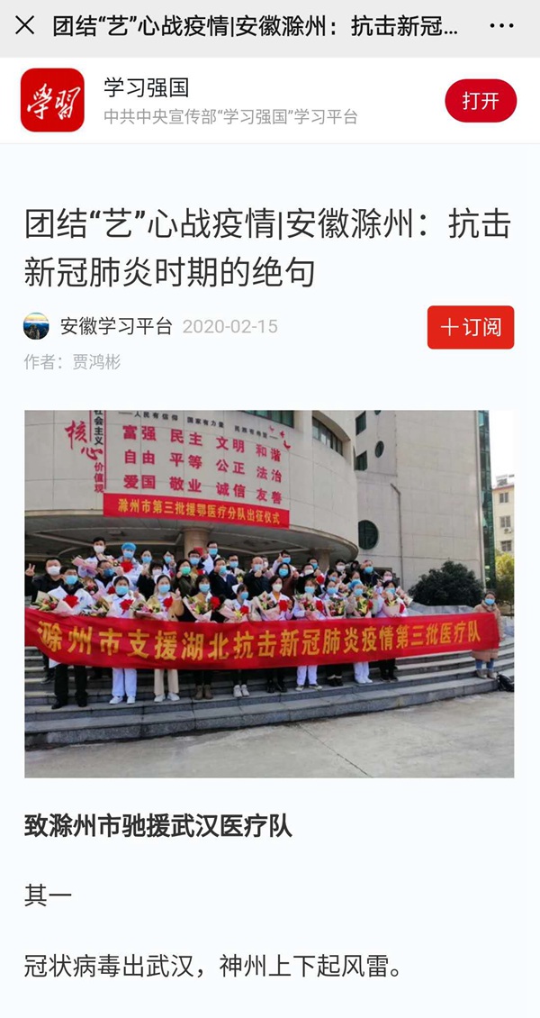 新冠肺炎疫情发生以来,滁州市文联党组认真贯彻落实习近平总书记和党中央决策部署,按照上级文联、市委市政府的倡导和安排,组织引导全市各级文联组织和广大文艺工作者迅速行动起来,在做好自身防控措施的同时,紧密结合疫情防控形势,积极发挥文艺优势,充分运用新媒体平台,组织开展了“战疫情”主题文艺创作及宣传活动,以艺术之力凝聚民众战击疫情的强大精神力量。