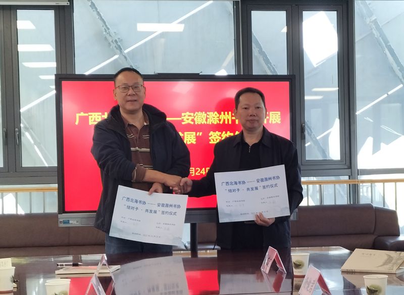 座谈会上,于晓波代表滁州市委宣传部、市文联,对广西艺术家到滁州采风创作表示欢迎,并向广西艺术家介绍了滁州人文历史和文艺发展情况。刘蒙平感谢滁州市委宣传部、市文联对广西书协文艺采风团热情周到的安排,并介绍了广西书协、北海文联的基本情况。随后,北海、滁州文联就书法家协会工作情况,开展“请进来、走出去”文艺交流活动等进行了交流和探讨。北海、滁州文联负责同志就两地书协“结对子·共发展”举行签约仪式。