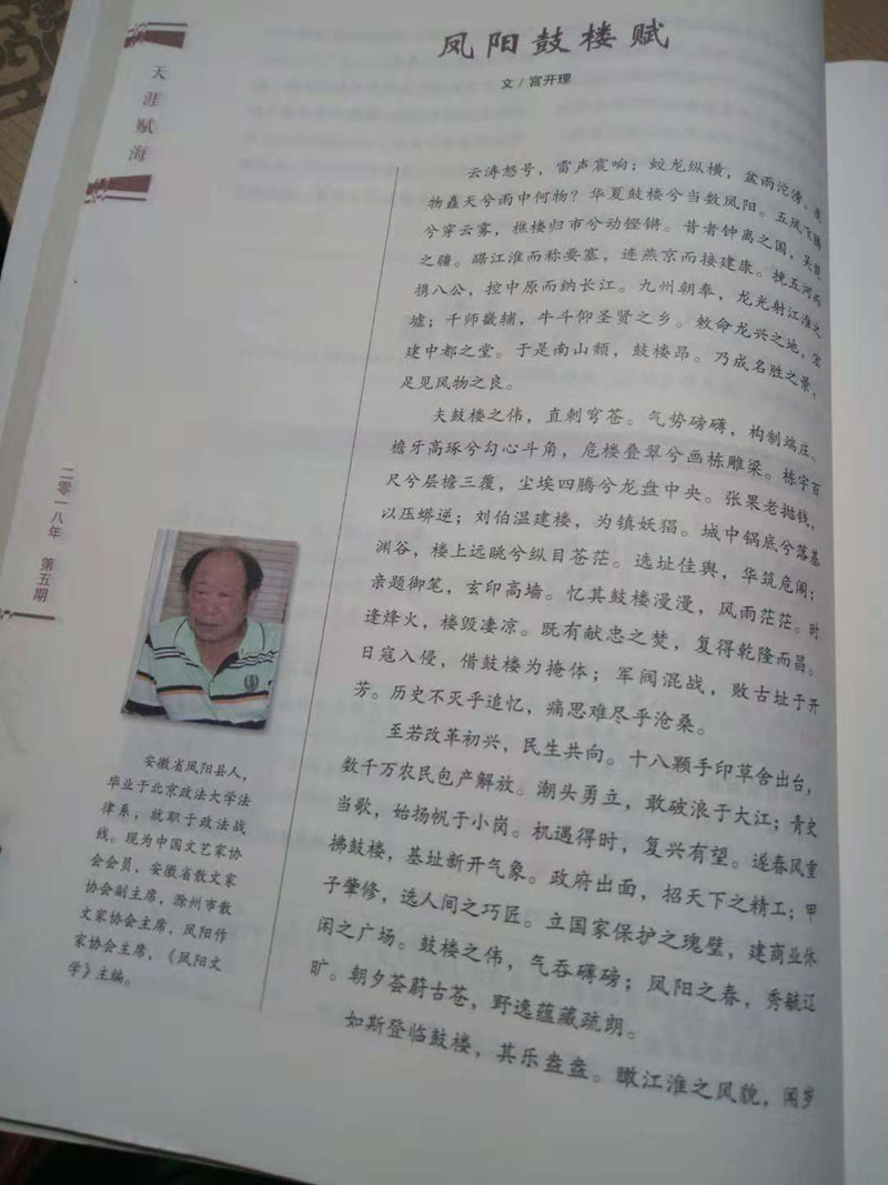 凤阳县作协主席宫开理作品《凤阳鼓楼赋》入选国家级期刊《中华辞赋》2018年第5期。