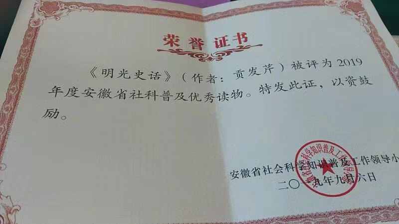 2019年度安徽省社会科学知识普及优秀读物评选活动于2019年9月6日结束,安徽省文史馆特约研究员、安徽历史学会会员、安徽政协文史资料学术研究会会员,明光市政协常委、文化文史和学习委员会主任贡发芹同志撰写的40万字历史散文集《明光史话》获得安徽省社会科学知识普及优秀读物奖。