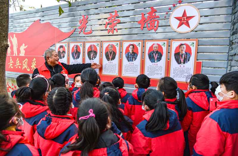 《曾参加对越自卫反击战荣立三等功的桑和雨,在“老墙根”前给小学生们讲述革命历史、激发孩子们的爱国情、报国志》 作者:王旭波