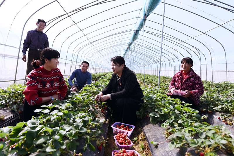 《全国脱贫攻坚先进个人王晓丽(右二)在全椒县草莓种植基地,指导脱贫攻坚工作》 作者:张丽