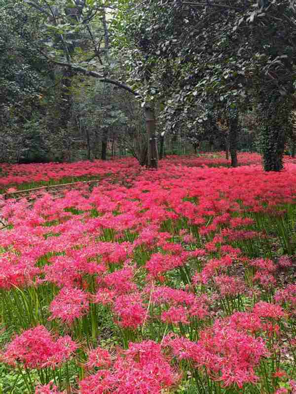 忽想起三十年前秋分日,第一次来皇甫山偶见此花。彼时皇甫山尚是原始风貌,山道旁,溪水边,竹林畔,枫杨下,一株两株三五株,随意散落山间,株株猩红,熠熠生辉。不知花名,问一旁走过的护林员,回道:“石蒜。”